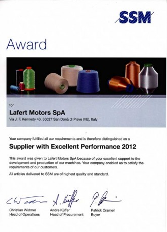 Lafert awarded as "SSM Supplier with Excellent Performance 2012"